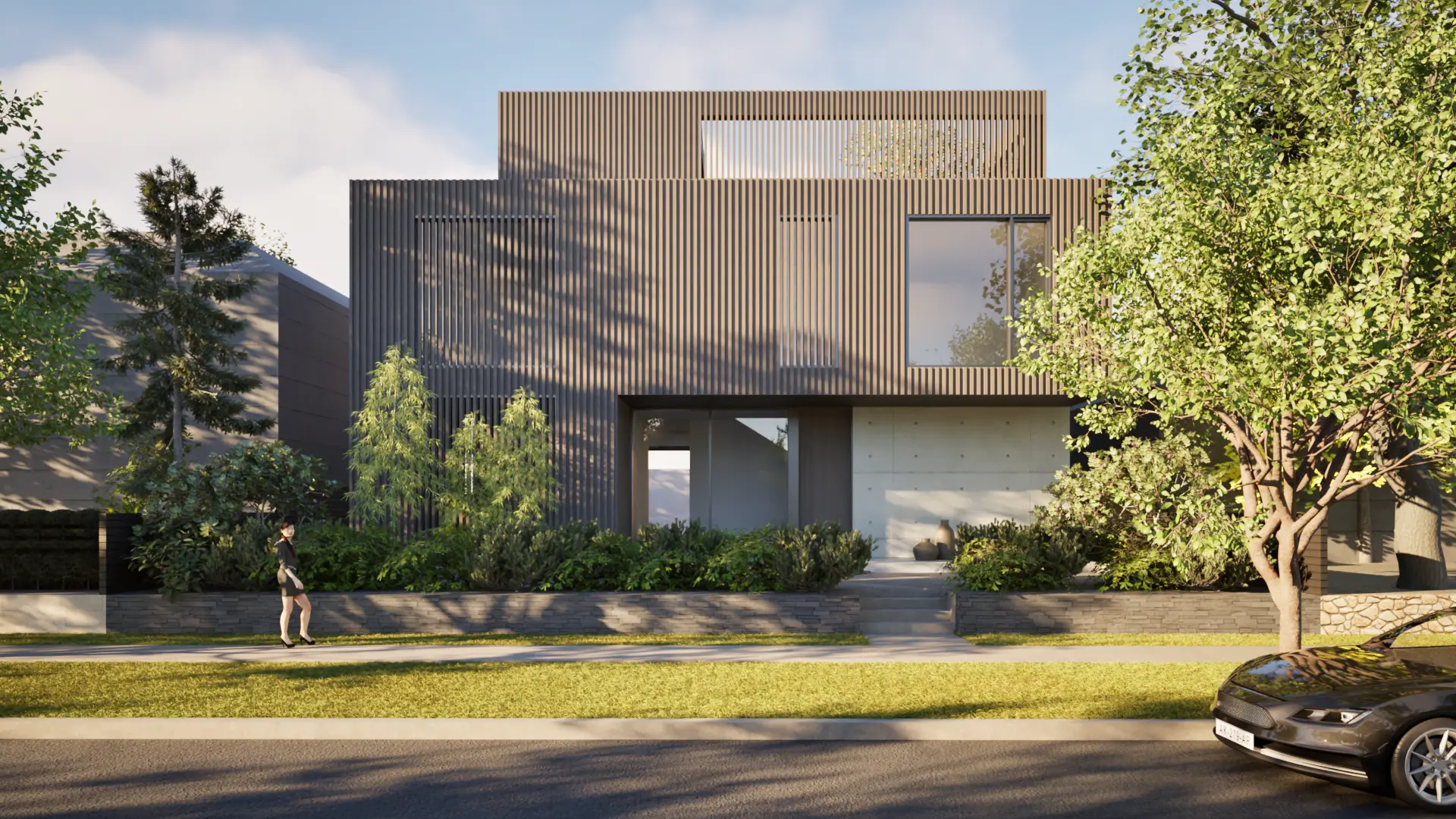 Aerie House is conceived as a restrained geometric form on a flat inner-city lot, designed to fulfill the client’s wish for a private retreat that also stands as an art piece. The exposed site makes privacy the primary challenge. The front yard, raised above the sidewalk, is layered with concrete walls and continued wood slats that filter sightlines while admitting light. At the rear, the house opens fully to a generous yard, where a projecting overhang extends living spaces outward and provides year-round shelter.