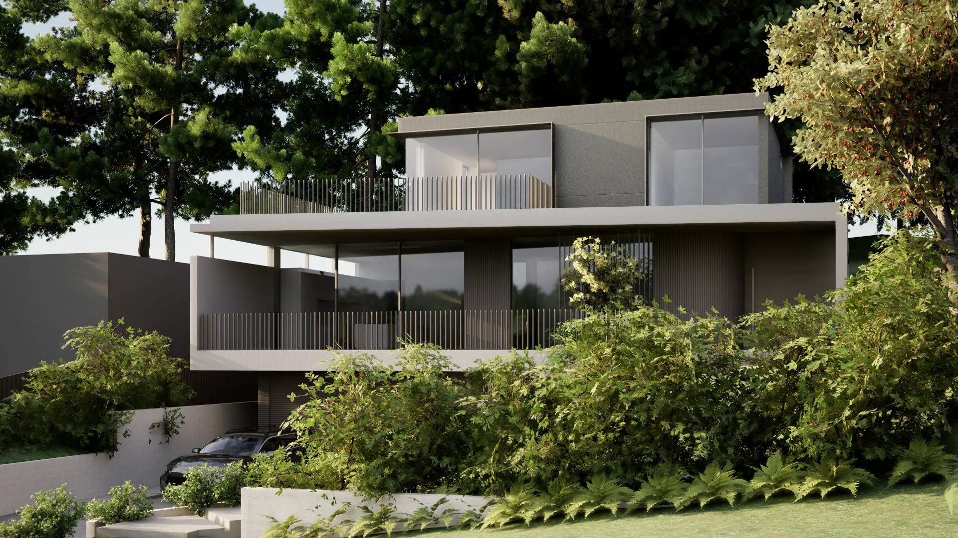 The Cairn House site posed a complex set of challenges: a steep north–south slope layered with a secondary east–west grade, strict zoning envelopes, and an exposed street frontage. The clients sought expansive southern views but also privacy from the road. The house is conceived as a composition of offset plates, each shifting in relation to slope and setback. The name Cairn House reflects this stacked strategy — like stones balanced in sequence, each floor plate settles into place as both marker and response to terrain and regulation.